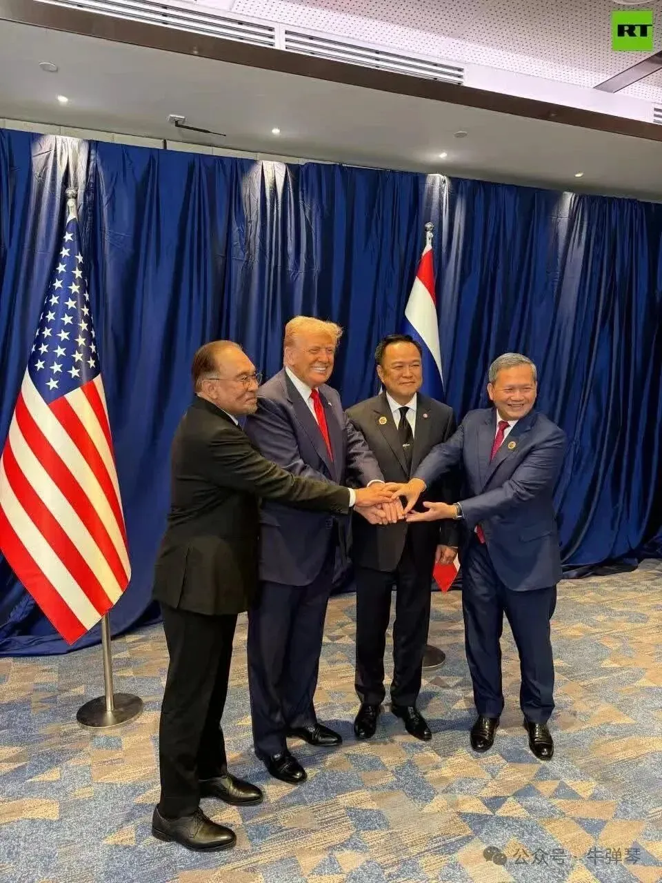 泰国总理和柬埔寨首相坐在中间,特朗普和马来西亚总理安瓦尔分坐在两侧。